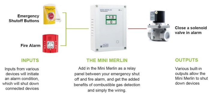 If there is a dangerous build-up of gas or unsafe levels of carbon monoxide at the sensor, this device can shut off the gas supply via a gas safety valve and/or a gas fire appliance. A code requirement in Florida, Georgia & Texas. This device has additional features for resetting systems, as well as audible and visual alarms – it can also be integrated with a Building Management System (BMS). For further information on our Mini Merlin refer to our datasheets or alternatively contact our offices today.