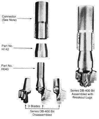 The Series DB-400 bits with blade sizes from 231/32` (75.4mm) through 4¼` (108mm) designed to be used on light or medium weight drilling equipment which normally employs N-rods 23/8 O.D. (60.3mm) or equivalent size drill pipe. For larger pipe, it is recommended that Type AC-600 bits be used.