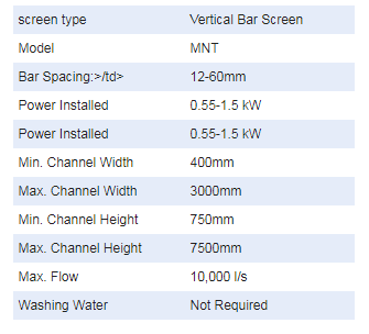 Screen is composed of bars obstructing the solids present in the effluent. Cleaning of the screen is achieved by means of 2 rakes with teeth moved by 2 chains.