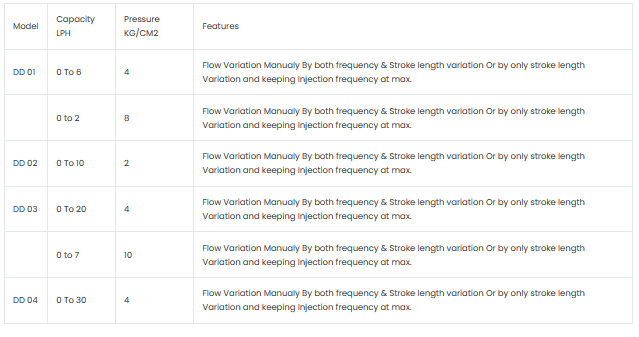 Electronic Dosing Pump. Electronically operated mechanically actuated Diaphragm. Adjustable injection frequency (15 to 100 SPM ) & Stroke length Compact size, light weight, more robust structure. Unique double ball check. NRVs for better dosing accuracy. Solenoid drive with minimum moving parts. 1 MWC max suction lift. Steady state accuracy +/- 5% Repeatability +/- 5.
