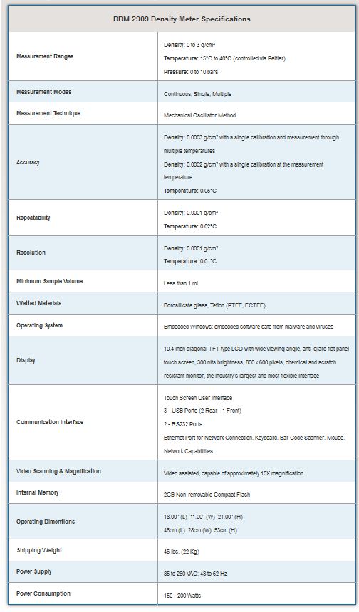 The Rudolph DDM 2909 Automatic Density Meter features built-in Peltier Temperature Control of the Sample, Full Range Viscosity Correction, Reference Oscillator and VideoView for easy bubble detection, and is fully GMP/GLP Compliant. With the flexibility of Windows the DDM 2909 is Network ready with Internet connectivity allowing remote access to Rudolph Research Analytical’s Service and Technical Support Team.