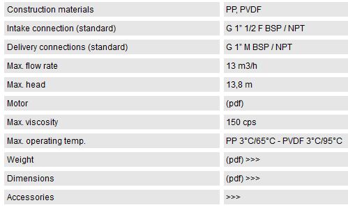 A couple of magnets leads the operation of the pump; the outer magnet placed on the drive shaft transmits the motion to the inner magnet integrated with the impeller that is hermetically insulated. The pump impeller is not physically fixed to the drive shaft, seals are therefore eliminated and this consequently avoids leakages of the liquid drawn by the pump which are usually due to its wear and tear. The pump head is manufactured with few components, thus the maintenance of which becomes extremely easy. The materials used as standard are polypropylene (pp) and polyvinylidene fluoride (pvdf). The pumps can’t run dry. Dirty liquids can reduce the pump life. Working temperatures: PP min -10/max 65°c - PVDF min -10/max 90°c.