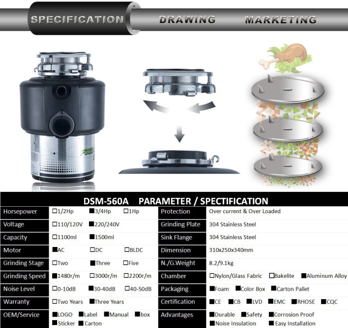 DSM-560 food waste disposer: 3/4 Hp,560W,1480rpm/1780rpm,AC motor,114mm feeding mouth dimentions.