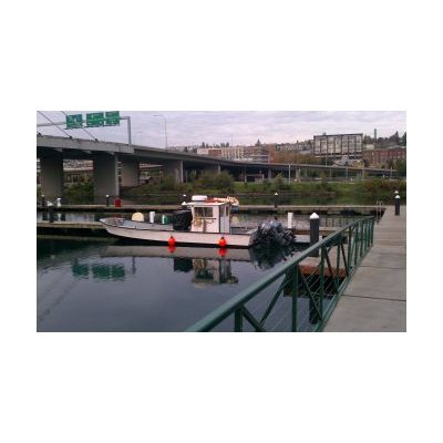 The Loon is a 36′ fiberglass work scow. Its flat bottom and fully-operational bow ramp allow it to work safely in shallow waters and increase diversity for emergency spills and shore related work. The Loon is powered by two 115 horsepower, 4-stroke outboards attached to pipe racks and mounted directly to the transom. It is moored in Portland, OR.