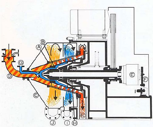 - The slurry to be treated is introduced to the centrifuge through a feed tube (D). Under centrifugal force, the particles are projected against inner surface of the rotating basket.