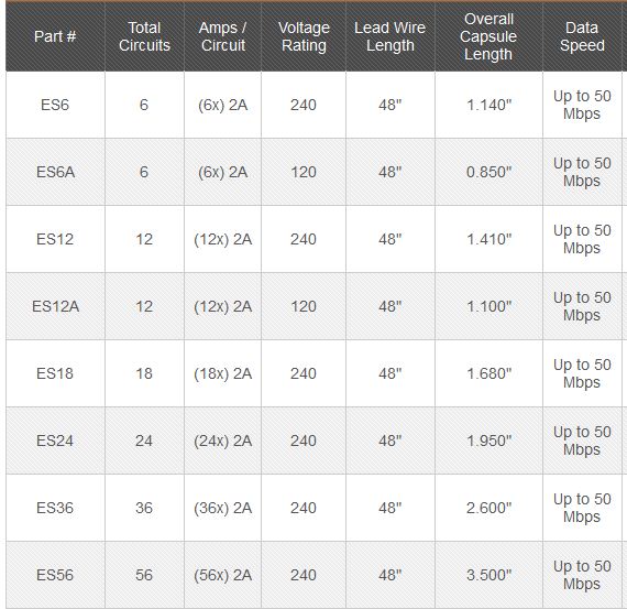 The ES Series compact capsule electrical slip rings feature a low torque design with gold-on-gold contacts and low electrical noise. The ES Series include flexible, color-coded lead wires suitable for transferring analog and digital signals. Models are available in 6, 12, 18, 24, 36, and 56 circuits. Ethernet options also available.