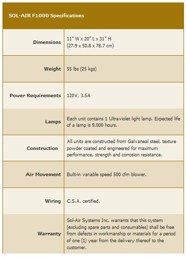 The Sol-Air F1000, with its patented proprietary Ultraviolet system, has a built-in blower system and is ideal for the residential, medical, hospitality and restoration sectors.