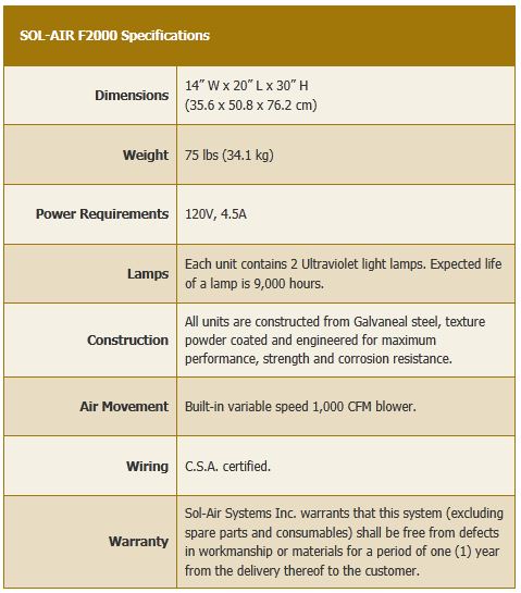 Our most versatile F-series model, the Sol-Air F2000, with its patented proprietary Ultraviolet system, is an upgraded version of the F1000 featuring the ability to run under variable conditions. It includes dual processing chambers and a variable 1000 cfm blower. The F2000 is ideal for residential, medical, hospitality and restoration sectors.