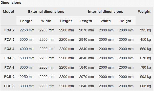 Foldable storage containers are made of trapezoid sheet-metal of 0,75 mm thickness, bearing sections of 2 mm thickness and wooden bottom of 35 mm thickness. A double-wing door with a handle and a lock are placed in the front wall and a single/double door in the side wall. The container is equipped with cradle attachments. The containers are delivered dismantled and may be stacked up to 7 layers. It is possible to combine various lengths on a truck. It takes 1 - 2 hours to assemble. The containers may be also delivered assembled. The FCA storage containers do not include a spill pallet. The FCB containers are fitted with a spill pallet made of 2,5mm-thick metal-sheet. The volume of the pallet is either 275 litres in case of a 3-meter-long container or 202 litres in case of a 2-meter-long container