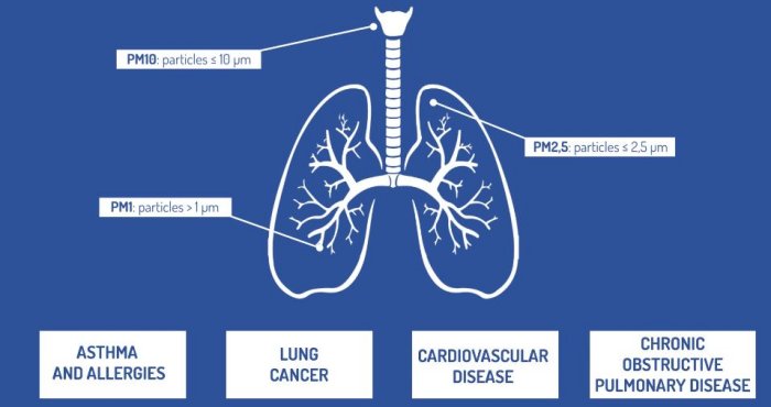The electrostatic filter has a high germicide power, features that normal mechanical filters do not possess. It is important to focus the attention on the fact that electrostatic filter originates an inactivation of contaminants, unlike the mechanical filtration which does not guarantee it and create in the long run a collection of live contaminants which proliferate and form germs colonies, exposing the environment and the maintenance man operator at a high risk of infection. As you can see in the image below, contaminants, according to their size, they can enter inside our body and wear out certain organs. With electrostatic filters this problem is eliminated as pollen, dust mites, fungus and other contaminants, being captured and inactivated, they cannot enter inside the body and therefore there is an improvement in the individual’s health quality.