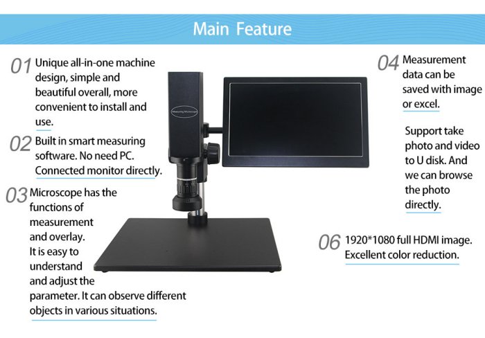 Unique all-in-one machine design,more convenient to install and use. Zoom 0.6-5X .Working distance 86mm. Support take photo and video to U disk.Measurement data can be saved with image or excel.1920*1080 full HDMI image. Excellent color reduction