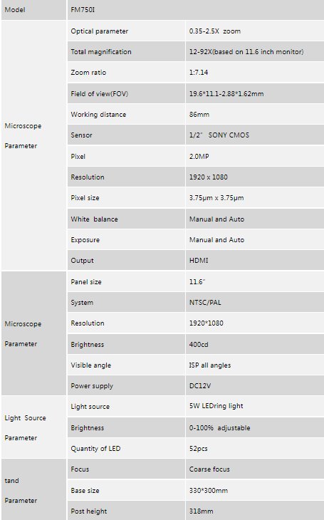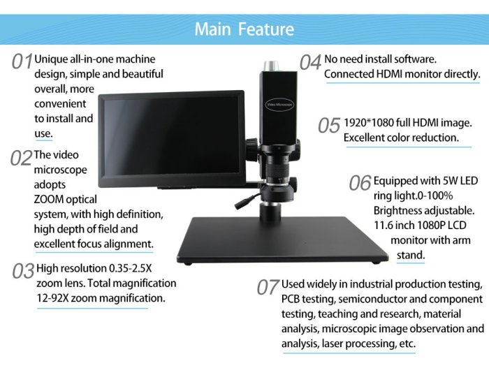 Unique all-in-one design.0.7-5.0X, working distance is 86mm.1080P high resolution.HDMI output,60fps. Optional auxiliary objective lens.