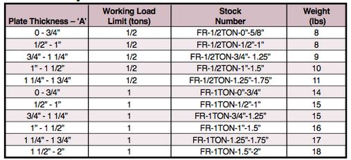 The Model FR is a vertical lifting tool for relatively light work. It is small and easy to handle in capacities through three tons. It incorporates a `Lock Closed` feature which facilitates attaching the clamp to the plate.