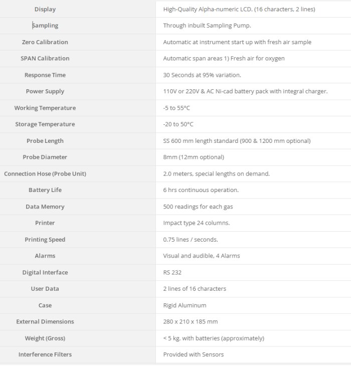 The highly upgradable GA – 152 model can be AC Powered and/or Battery operated. It may include a chargeable battery, battery charger, Sampling Probe with condensate trap and an inline Micro Filter and an inbuilt Sampling Pump. It can be built to include upto 8 Nos. of Gas Sensors and Temperature Sensor, Draft/ Pressure besides the calculated parameters and have options of :
