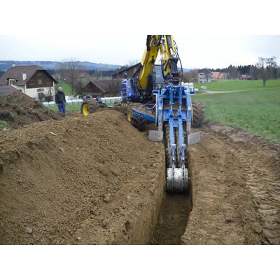 This trencher with boom can be used both in combination with an excavator and together with a tractor. The assembly can be done with just a few hang-ups. Thus, the device is very suitable even for short milling lengths. A significant advantage of this milling machine for pipeline construction is that it has a slewing ring as standard. This makes it possible to mount the milling machine laterally offset to the excavator or tractor. Thus, the vehicle itself can stand far enough away from an obstacle and still cut a trench for pipes directly behind it. In addition, such a slewing ring allows work on steep slopes or in areas with embankments.