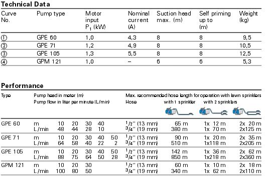 - Pump: GPE 60, GPE 71: Single stage jet pump with stainless steel pump housing and stainless steel impellers. GPE 105: Multistage centrifugal pump with stainless steel pump housing and noryl impellers.