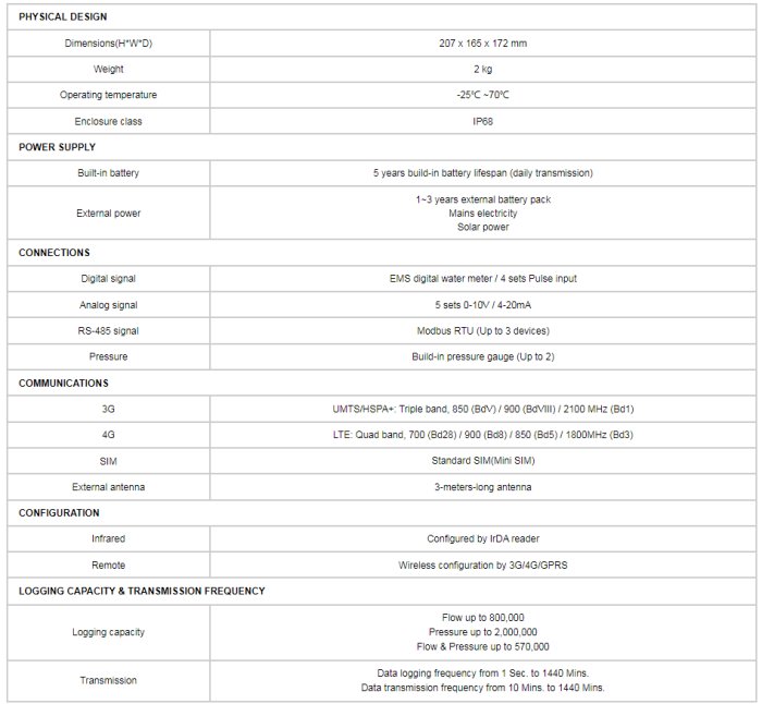 - Data logging and LCD display of totalizer, forward/reverse flow, flow rate, pressure, voltage, and signal strength