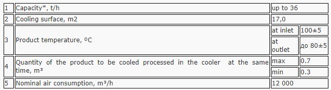 Then the seed cake moving along the inclined surfaces of the panels 2 is cooled by the air flow which after that is withdrawn through air duct into cyclone and ventilator. The cooler design allows for regulation of the product movement speed and correction of its temperature respectively. The movable panels 2 which can be installed at various angles are used for this purpose. The equipment is easy to operate. The removable panels 3, which can be used, when required, for air flow improvement, are provided for repair of the conveyer and inner components of the cooler.