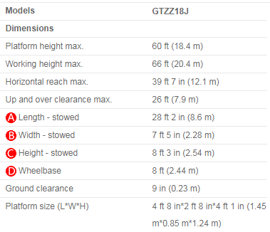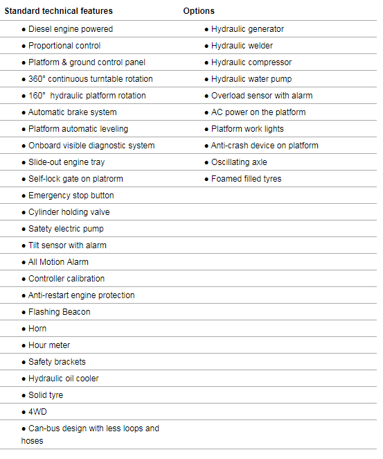Platform height 18.4m,Working height 20.4m,Outreach 12.1m,Payload 250kg,Diesel Engine,Options available for:Working light, Foam tire, Platform AC power,Caution light,Oscillating axle ,Cold Boot.