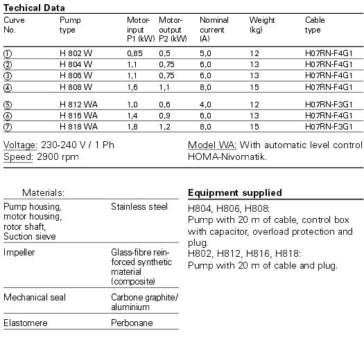 HO MA high-pressure submersible pumps are suitable for pumping clear water with high pressure, even from boreholes or narrow wells. They are used for domestic water supply, irrigation, garden watering from cisterns or similiar, in fountain displays, watering place, heat pumps, ground water drainage and so on. In combination with the electronic control panel HPS 2 or with a pressure tank, pressure switch and an electrical control panel the pumps can operate automatically (see accessories). Installation: The pumps operate in vertical or horizontal psoition. For vertical operation in a well the pump must be suspended on a rope. Pumped liquid: Clearwater. Max. teperature of the liquid: 35°C. Operation: permanent (S1)