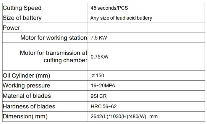 Separate the lead acid battery acid, case, grid and paste. This hydraulic battery cutter can cut the lead acid battery into 4 parts and empty the acid inside. After cutting, the case can be removed easily manually from paste and GRID. The paste and GRID can be fed into shredder for size reduction and further separating. The paste and GRID also can be directly fed into rotary furnace or blast furnace directly for smelting and reduction.