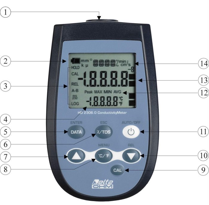 The Conductivity meter – Thermometer Model HD2306.0 is a portable instrument, fitted with a large LCD display for excellent visualization of the measured data, that allows measurement of the following: conductivity; liquid resistivity; total dissolved solids (TDS); with combined 4-ring or 2-ring conductivity/temperature probes. Temperature only is measured by Pt100 or Pt1000 immersion, penetration or contact probes. The probe calibration can be performed automatically in one or more of the 147μS, 1413μS, 12880μS or 111,800μS/cm conductivity calibration solutions (see chapter 4). Using the Max, Min and Avg function of this instrument respectively obtains the maximum, minimum or average values.