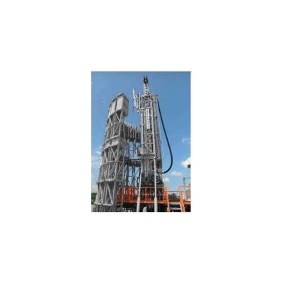 One noticeable characteristic is the rig’s self-erecting telescopic mast composed of a single hydraulic cylinder that, although shorter than most conventional rigs, is capable of handling single stands of range 3 drill pipe. Perhaps the most noteworthy feature is the rig’s vertical pipe rack delivery system. The top drive is fully integrated with the vertical pipe rack through an automated pipe handler that rotates within the system. The top drive is equipped with a torque wrench for making up drill strings and has a horizontal displacement capability for moving pipe between the center hole and mouse hole. The pipe rack consists of a number of mobile bins with the pipe handler installed on a vertical rotating tower in the middle. Clamps grab the drill pipe from the bins and transfer them to the mouse hole according to your preset trip plan.