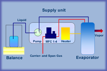 HOVACAL is a calibration gas generator especially designed for calibration of continuous emission monitoring systems. HOVACAL generates a defined mixture of air and water vapor and is also able to generate different other gas vapor mixtures like mercury chloride, hydrogen chloride, ammonia, hydrogen fluoride and others with defined concentration. The desired component is available as a standard solution in different concentrations. HOVACAL consists of an easy portable supply unit and an evaporator unit. Supply and evaporator unit are connected via tubes for liquid and gas and electrical cable for power supply and RTD signal. For generating a defined water vapor concentration, gas flow will be adjusted with the build in mass flow controller and the liquid flow will be achieved with a peristaltic pump. To obtain accurate concentrations, it is necessary to determine the liquid flow with means of a analytical balance.