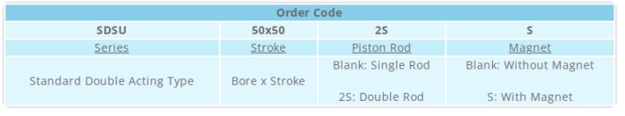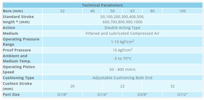 Features: Conforms to ISO 15552 (Previosuly ISO 6431), Configuration with or without magnet, Available in single and double acting configuration, Available in single and through rod configuration, Wide variety of seal available like NBR, Polyurethane, Viton, Non corrosive stainless steel piston rod, Extensive range of accessories for mounting the cylinder in various positions, Low friction operation, hence longer service life