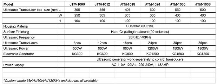 Immersible ultrasonic transducer box-embedded in your existing tank. Good quality custom made size chemicals resistance-moveable-convenient install JTM series immersible ultrasonic transducer system includes transducer box and generator. It can be used when the standard model ultrasonic cleaner is inapplicable in the specific working conditions, besides may have the special specification made to order. The transducer box and generator are separate but work together to operate ultrasonic cleaning process with transducer box immersible mounted in fluid tank. The transducer box is moveable in the tank for more convenience. The number and placement of transducers is selected to give maximum results in any parts cleaning tank with any cleaning load. Immersible ultrasonic transducer units can be installed in the tank by three ways: Side and/or bottom mounted or top mounted depending on the tank geometry. The specification of transducer boxes are available for custom made.