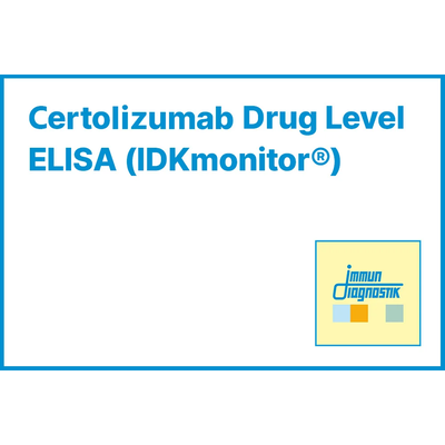 Certolizumab is the Fab’ fragment of a recombinant humanised antibody conjugated to polyethylene glycol (PEG) and is therefore also known as “certolizumab pegol”. Certolizumab pegol (Cimzia®) is a TNF-alpha inhibitor used for the treatment of chronic inflammatory diseases, such as Crohn’s disease and rheumatoid arthritis. The IDKmonitor Certolizumab Drug Level ELISA kit is a microplate-based quantitative enzyme linked immunosorbent assay (ELISA) for the determination of free certolizumab therapeutic drug in serum and EDTA plasma samples allowing clinicians to evaluate the drug efficacy and investigate primary non-response, loss of response and non-remission.