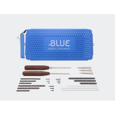 1 x Box for locking screws and instruments 2.0/2.4/2.7/3.5mm, 1 x Stardrive screwdriver T6 2.0mm, 1 x Stardrive screwdriver T8 2.4/2.7mm, 1 x Locking screw drill guide 2.0mm, 1 x Locking screw drill guide 2.4mm, 1 x Locking screw drill guide 2.7mm, 1 x Drill Bit 1,5mm, 1 x Drill Bit 1,8mm, 1 x Drill Bit 2.0mm, 3 x Self tapping locking screw Titanium Stardrive 2.0mm - 8mm, 3 x Self tapping locking screw Titanium Stardrive 2.0mm - 10mm, 3 x Self tapping locking screw Titanium Stardrive 2.0mm - 12mm, 3 x Self tapping locking screw Titanium Stardrive 2.0mm - 14mm, 3 x Self tapping locking screw Titanium Stardrive 2.0mm - 16mm, 3 x Self tapping locking screw Titanium Stardrive 2.0mm - 18mm, 1 x Self tapping locking screw Titanium Stardrive 2.0mm - 20mm, 1 x Self tapping locking screw Titanium Stardrive 2.0mm - 22mm, 1 x Self tapping locking screw Titanium Stardrive 2.0mm - 24mm