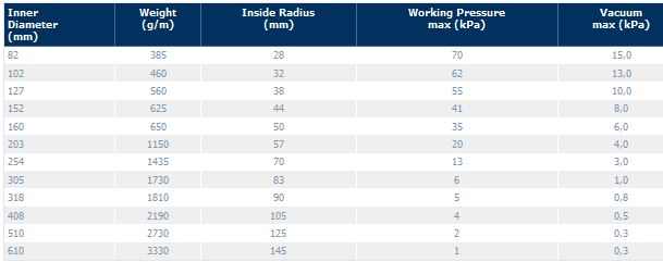 Application Transport of gases, vapors and dust.Properties Light, compressible, very flexible.Material Glass fibre fabric coated with PVC and reinforced with a spiral made of steel wire.Color Grey.Range of diameters 380 - 610 mm.Standard length