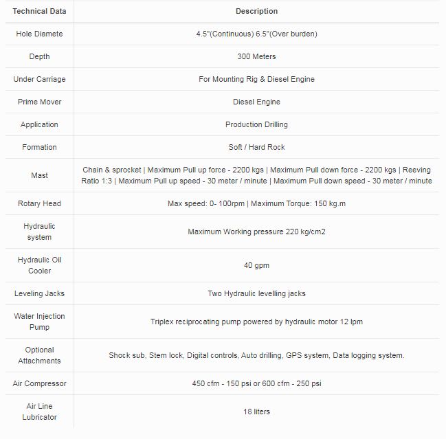 KLR-K2 maintains a high level of productivity even under the toughest conditions Advanced Hydraulics for boom and feed positioning, Rotation, feed, and tramming ensures superior performance. KLR- K2 capable to drill a hole diameter of 4.5” (continuous) and 6.5” (overburden) bore depth up to 30 meters. The optional attachments are shock sub, stem lock, Digital controls, Auto drilling, GPS System & Data logging system.