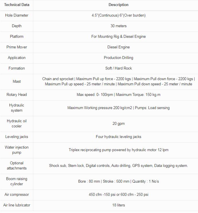 We offer KLR KWD 10 Rig, which are available in various models, sizes, and working capacities. The optional attachments are shock sub, stem lock, Digital controls, Auto drilling, GPS System & Data logging system. These drill rigs are suitable for hole dia 4.5” (continuous) and 6.5” (over burden) up to depth 30 meters.