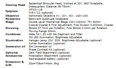 LB-204 Binocular Biological Microscope with Seidentopf Binocular Head, Wide Field Eyepiece, Backward Quadruple Nosepiece, Achromatic Objectives and LED Illumination is economic, practical and easy to operate. These microscopes adopt LED illumination, which save energy and have long working life, it is also very comfortable for observation. These microscopes are widely used in educational, academic, agricultural and study field. With a microscope adapter, a digital camera (or digital eyepiece) can be plug into the trinocular tube or the eyepiece tube. Built-in rechargeable battery is optional for outdoors operation or places that power supply is not stable.