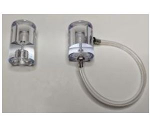 - Liquid Sampling: Flat or conical bottom collection vial made of polycarbonate. Volume of 0.65 mL for liquid or gel substrate. Flat bottom ported vial includes two M3 SS barb fittings with Nylon washer for 1.5mm ID flexible tubing (Tygon® or Teflon® recommended). Conical ported vial uses a M6 thread that accepts IDEX/UpChurch flangeless fittings. Other configurations are possible.