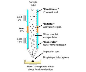 The final cool “moderator” region allows continued droplet growth while reducing the flow temperature and water vapor content. This lowers the vapor content below saturation levels at ambient conditions and avoids unwanted condensation downstream of the collection region. Droplet growth occurs at temperatures close to ambient (25-30ºC in the flow stream) providing robust collection for volatile constituents, reducing changes in the particle chemical composition, and maintaining microorganism viability.