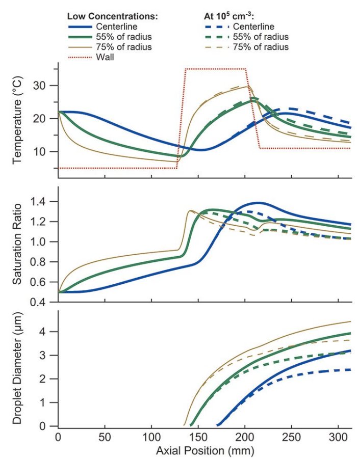 Supersaturation occurs in the second region as a result of the difference in the diffusive rates of water vapor and heat transport. The warm walls of the “initiator” provide a region high of partial pressure of water vapor. Because the mass diffusivity of water vapor is larger than the thermal diffusivity of air, the water vapor diffuses into the flow faster than it warms. To reach a desired state of equilibrium, the supersaturated air condenses water vapor on the tiny “seed” particles. The relative humidity in the initiator reaches values of 130-140% which is enough to overcome the surface energy associated with the curvature of the particle surface, and activate condensational growth of particles as small as 5-10nm diameter. The particles are enlarged into water droplets ~ 3µm diameter effectively forming a fog.
