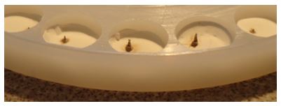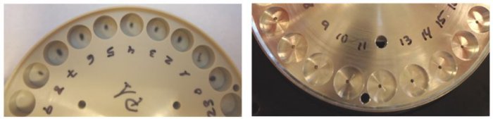 - Sequential Sampling into Multi-well Sample Plate: 32 well plates available with circular well shape (75 μL well volume) or teardrop well shape (120 μL well volume). PEEK® polymer or bare aluminum. Other materials and configurations are possible.