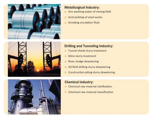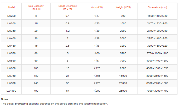 Such centrifuge applies to solid liquid separation of suspension liquids with solid phase particle equivalent diameter ≥ 3μm, weight concentration ratio ≤10%, volume concentration ratio ≤70% or solid liquid density difference ≥0.05g/cm . HSS has different series of decanter centrifuges with bowl diameter from 220 ~ 1100mm.The machine can be also sorted by bowl type, such as thickening, dewatering, classifying, clarifying etc., to be fit for different separations.