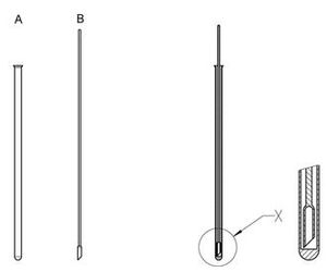 The precision capillaries B generate perfect gas bubbles within tube A for reproducible boiling point determinations.