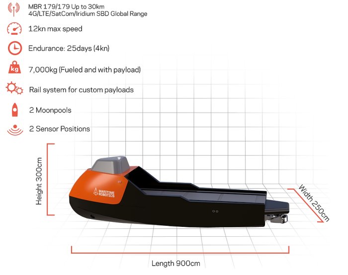 The MARINER X Unmanned Surface Vehicle (USV) is a multi-purpose unmanned vehicle for offshore and coastal applications. The Mariner X can be launched from port and transit offshore or deployed from vessel based davit. Designed primarily for survey not speed, the vessel has two actuated moonpools and two dedicated sensor positions. The MARINER X USV is made of polyethylene and offers a very stable, unsinkable and near maintenance- free construction. Maritime Robotics SeaControl allows for command and control of the MARINER X with SeaSight providing situational awareness through radar, AIS and camera integration. As standard the USV is fitted with a GNSS Compass, Class B AIS, Cameras, WiFi and LTE Modem. The deck space has a rail system to allow for mounting of custom payloads including survey navigation, satellite communications, deck generators, winches, and deck cargo.