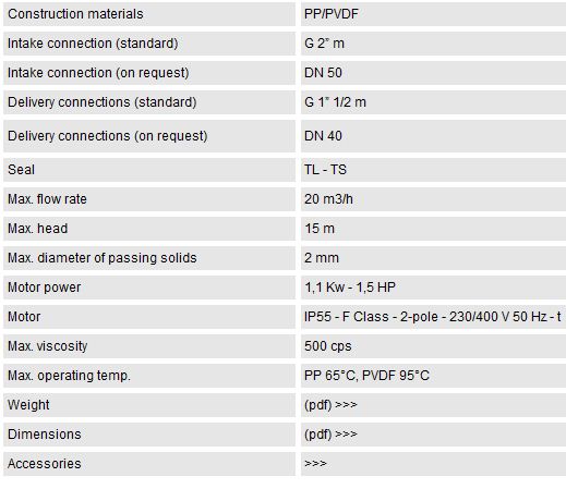 MB 110 resin-encased horizontal centrifugal pumps are pumps operated by a direct-drive motor (max 3000 rpm) for fast fluid transfer and/or drainage with flow rates ranging from 6 to 75 m3/hour. Their special open-impeller design allows pumping even with very dirty liquids having apparent viscosity up to 500 cps (at 20°C) and small suspended solids. There are two versions available with different internal mechanical seal depending on use, TL (lip seal) and TS (bellows seal).