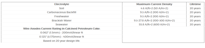 Consists of solid titanium wire which meets ASTM B348 Grade 1 or 2 standards, that has been coated with mixed metal oxide (MMO) coating. Coating consists of IrO2/Ta2O2 and is suitable for use in soils, freshwater, brackish water and seawater. MMO anodes have an extremely low consumption rate. The titanium substrate remains constant throughout the design life of the anode.