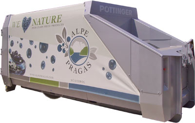 A press container’s appearance plays an increasingly important role for our customers. Due to the innovative design and replaceable advertising materials, the Pöttinger press container blends perfectly with contemporary architecture and provides a unique advertising benefit.