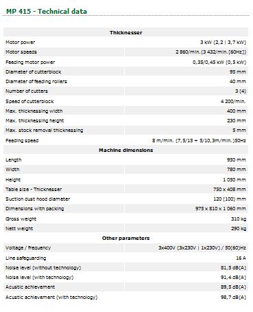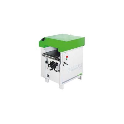 Planed thicknessing table. Cutterblock with three knives. Suction hood. Feeding switch off. Emergency stop. Overload protection. CE standards