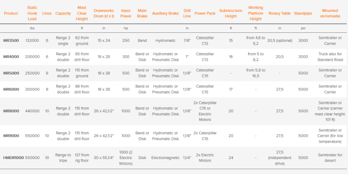 Drillmec MR Series mobile trailer and self-propelled rigs are used for conventional drilling, workover and well service applications. Drillmec covers this variety of applications by manufacturing a full range of rigs capacities from 60 up to 250 metric ton. The drawworks, carrier and mast capacities are combined to provide the best performances. The MR Series fully mechanically driven rigs are designed to ensure ease of operation in a wide variety of terrains and extreme climatic conditions. The MR Series design enables it to be inherently agile in order to access from the extreme hear of the Sahara desert, to the bitter cold of the Siberian tundra or the challenging elevation changes of the Utica shale.