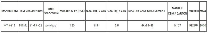 Item Description: 500ML, 11*7.5*22. Unit Packaging: poly bag.