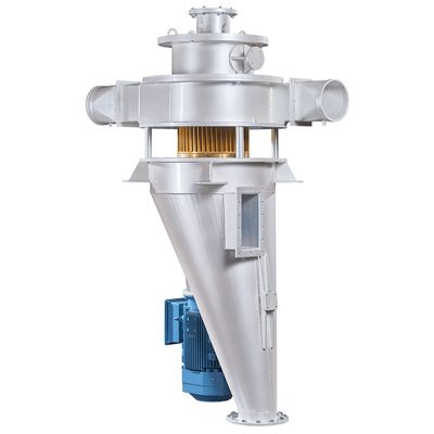 The GRC guide ring classifier from NEUMAN & ESSER is a latest generation high-efficiency air separator, which offers top yields, precise separation limits and minimum energy requirements. It can be operated as an independent aggregate and combined with a mill. The feed material is fed from the top using a vertical pipe. After the feed material drops into the dispersion unit, it enters the classification zone. The air required for classification carries the particles to the classifier wheel. Small particles, the fine materials, are being pulled through the classifier wheel by the classifying air. The fine material is then separated from the air in the following filter. The classifier wheel rejects particles which are too large and they reach the bottom of the classifier as coarse material. An airlock discharges this material there.